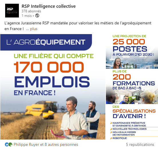 Car derrière les machines et les technologies agricoles, il y a des parcours de passion, des compétences de pointe, une dimension humaine forte et un rôle stratégique pour la souveraineté alimentaire et la transition écologique. Ce sont ces messages que l’agence RSP, aux côtés des acteurs du secteur, contribue à faire émerger et à traduire en signes forts, pour mobiliser, recruter, et donner envie de rejoindre les métiers de l’agroéquipement.